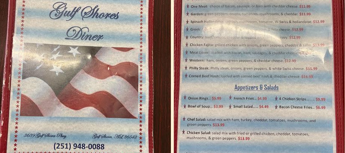 Gulf Shores Diner serves American diner cuisine. You'll find breakfast all day, along with lunch and dinner items like burgers, sandwiches, and salads.